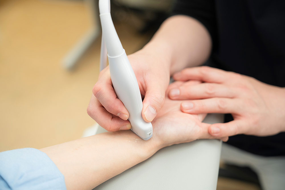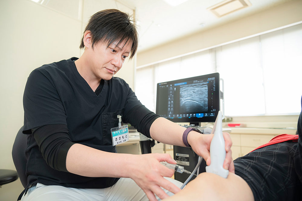 腫れているから捻挫だ。突き指だ。ではなく、当院では診察の際にできる限り超音波を活用し、患者さん自身が「見て理解できる診療」を心がけています。
